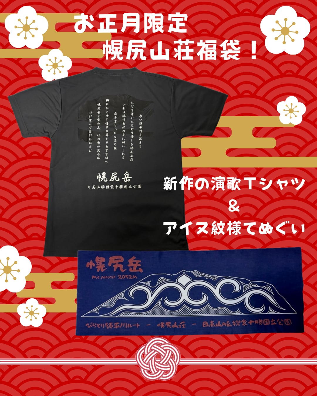 新作の幌尻岳・演歌Tシャツ+アイヌ紋様てぬぐいの福袋です!